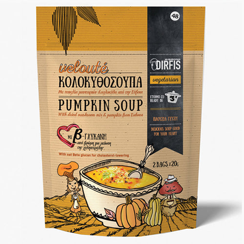 Η βελουτέ κολοκυθόσουπα με ποικιλία μανιταριών και κολοκύθα Δίρφυς έχει